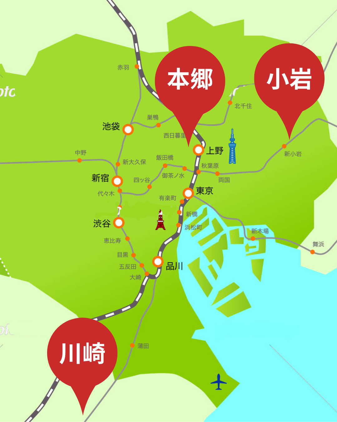 A. 本郷/川崎/(2026年新設)小岩です。通いやすい拠点の相談ができます。